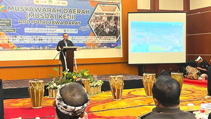 Iendra Sofyan, Kepala Dinas Pariwisata dan Kebudayaan Provinsi Jawa Barat saat memberikan sambutan pada acara Musda Ke-3 DPD PUTRI Jawa Barat di Sari Ater Kamboti, Kamis 20 November 2025. (Foto: Kliknusae.com/Adhi)