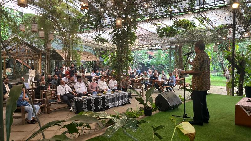 Ketua Gabungan Industri Pariwisata Indonesia (GIPI) Jawa Barat Herman Muchtar ketika memberikan sambutan di acara “Coffee Morning Vol IV” di Saung Angklung Udjo, Rabu 29 April 2026. (Foto: Kliknusae.com/Adhi)